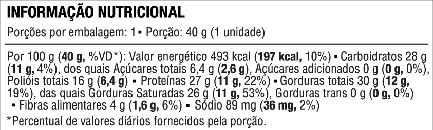 - Ingredientes selecionados: Chocolate preto sem açúcar, manteiga de cacau e crispies de quinoa, que proporcionam uma textura crocante e nutritiva.